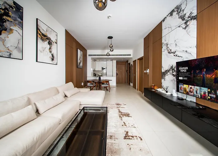Luxury 1 Bedroom Canalfront Apartment With Burj Khalifa Views From Resort-Style Pool - Walk To Jumeirah Beach Dubai is located only 0.8 km from Dubai Canal Walk and around a 25-minute walk from the key indoor Bay Avenue Mall. The spacious 84 m² apartment comes with a rooftop pool and a terrace overlooking the garden.